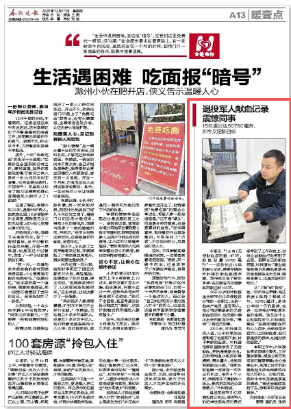 報道以《退役軍人獻血記錄 震驚同事》為題,生動講述了我公司員工葉科強——一位共產黨員、退役軍人,十五年來默默堅持無償獻血的善舉。其累計獻血147次、總量達50780毫升的驚人記錄,充分展現(xiàn)了堅韌不拔、熱心公益的崇高品質。